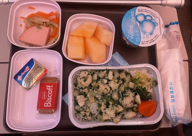 まずはピーナッツが配られドリンクが配られ、その後「チキンorビーフ?」と聞かれ「チキン」と答えました。チキンはご飯の上に鶏肉とブロッコリーを炒めたものがのっておりクリーム系でした。結構良かったです。パンも後ほど配られお腹がいっぱいでした。